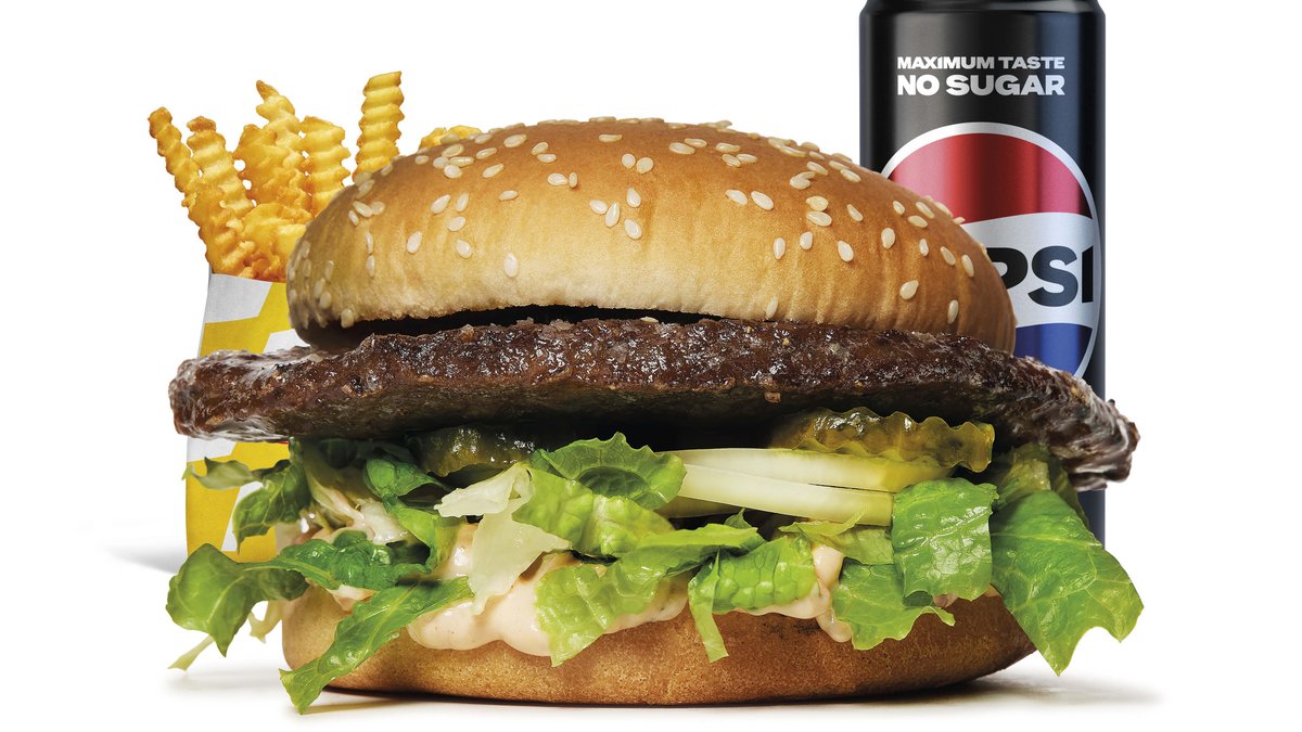 45 g hamburgare, hamburgerost, hamburgerdressing och isbergssallad. Liten pommez och valfri dryck ingår.
