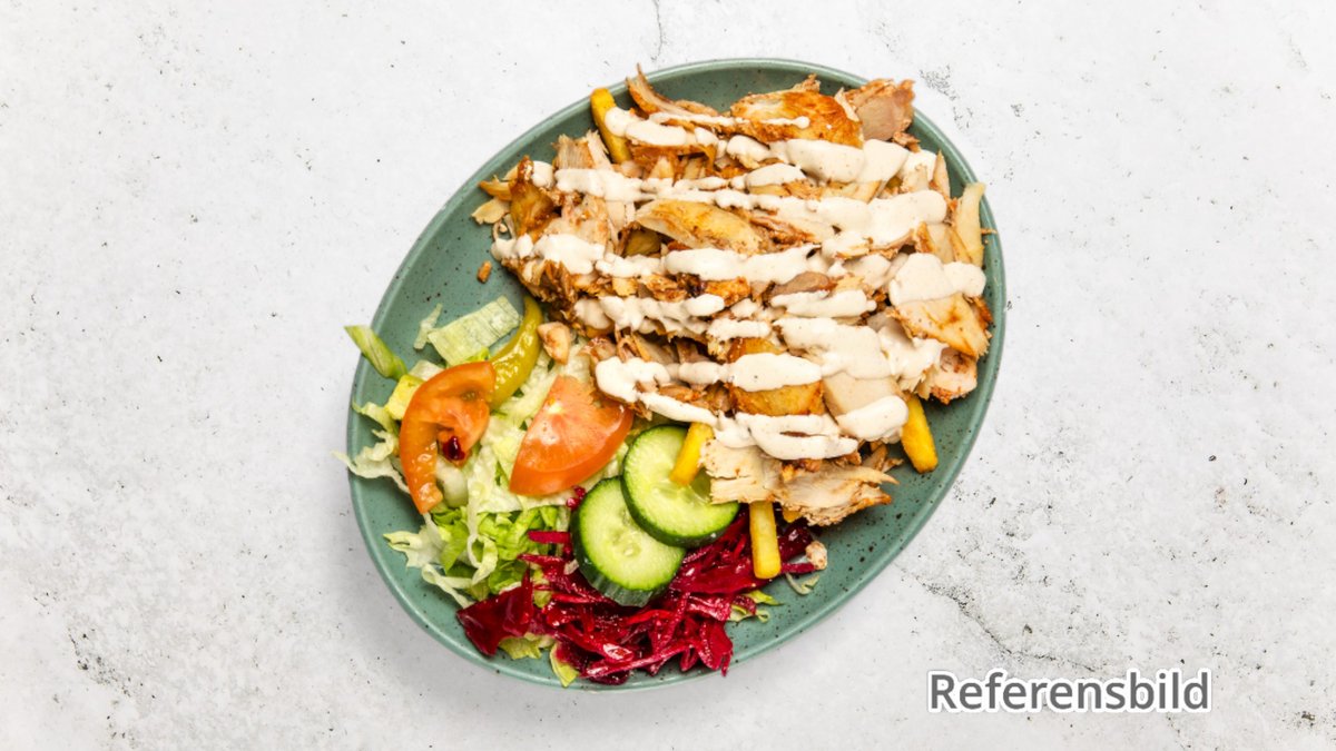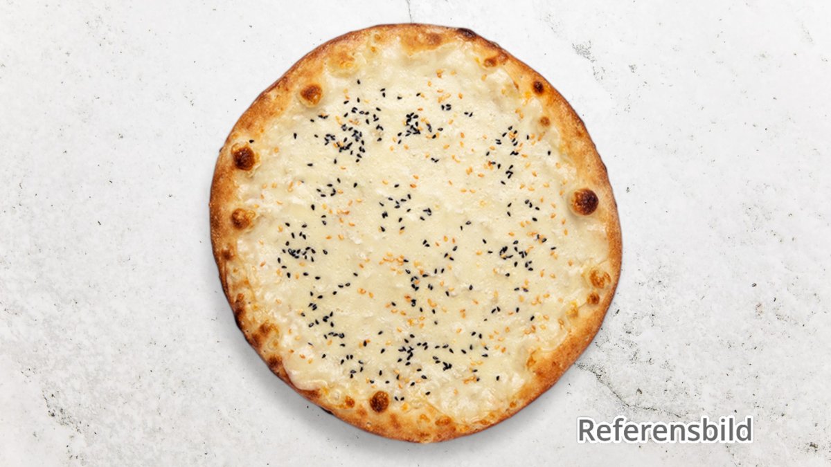 Tomatsås, ost, lök, champinjoner och kebabsås.