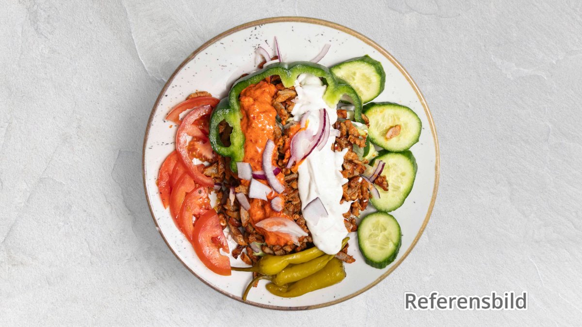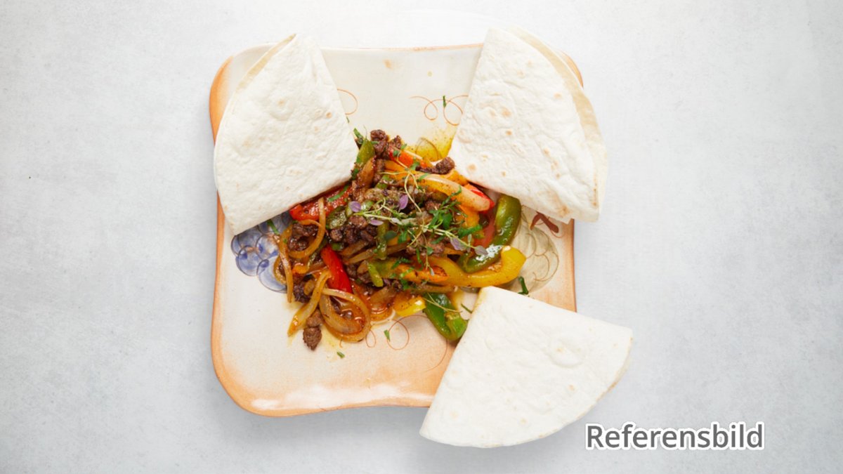 Kryddig rulle med saftigt kött, grönsaker och sås.