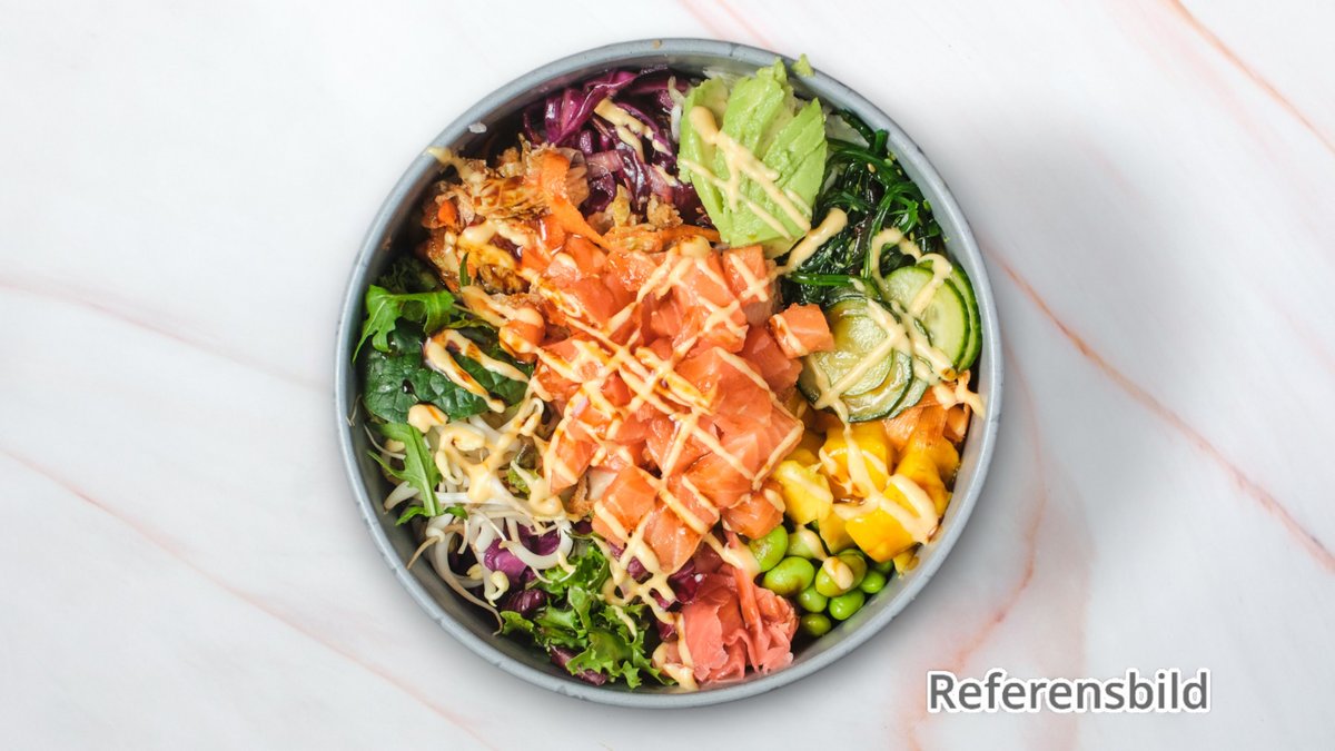 Serveras med sushi ris, sallad, sjögräs, sallad, sesamfrö, ingefära, sojabönor, gurka, chilimajo och sesamfrön.