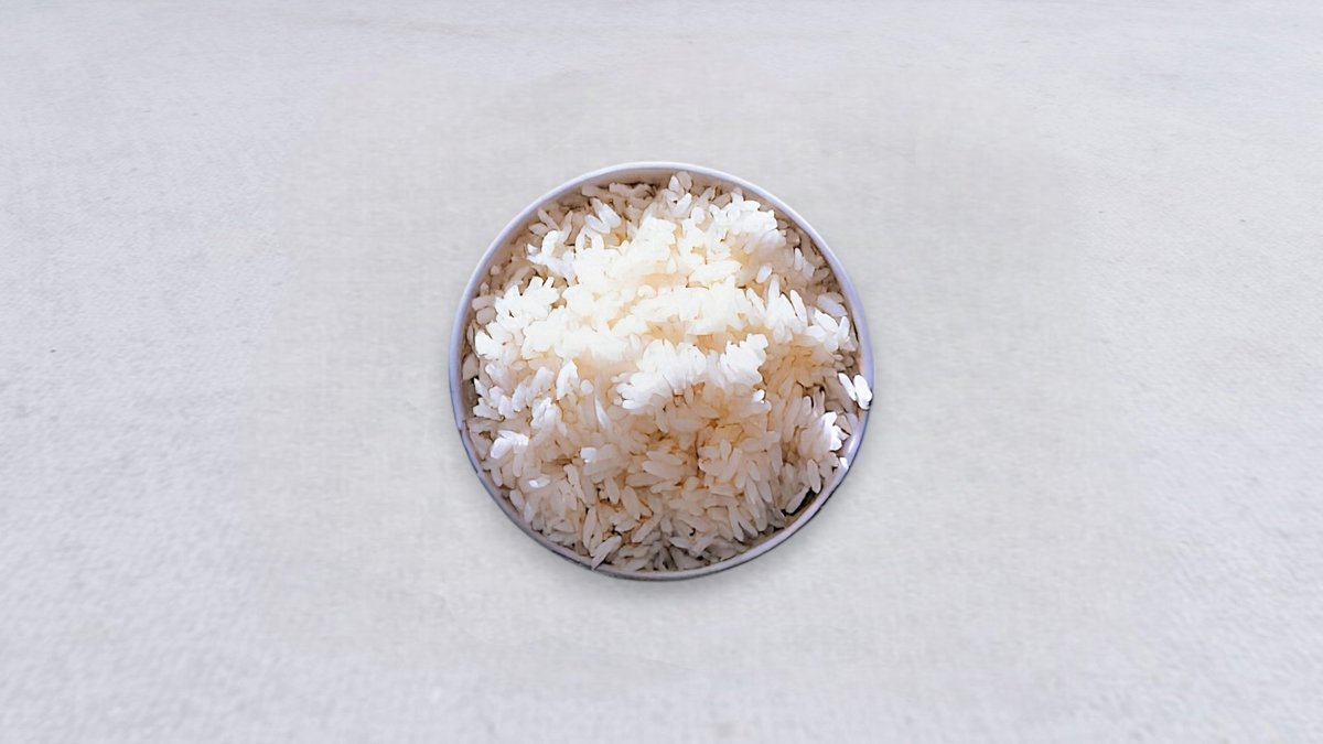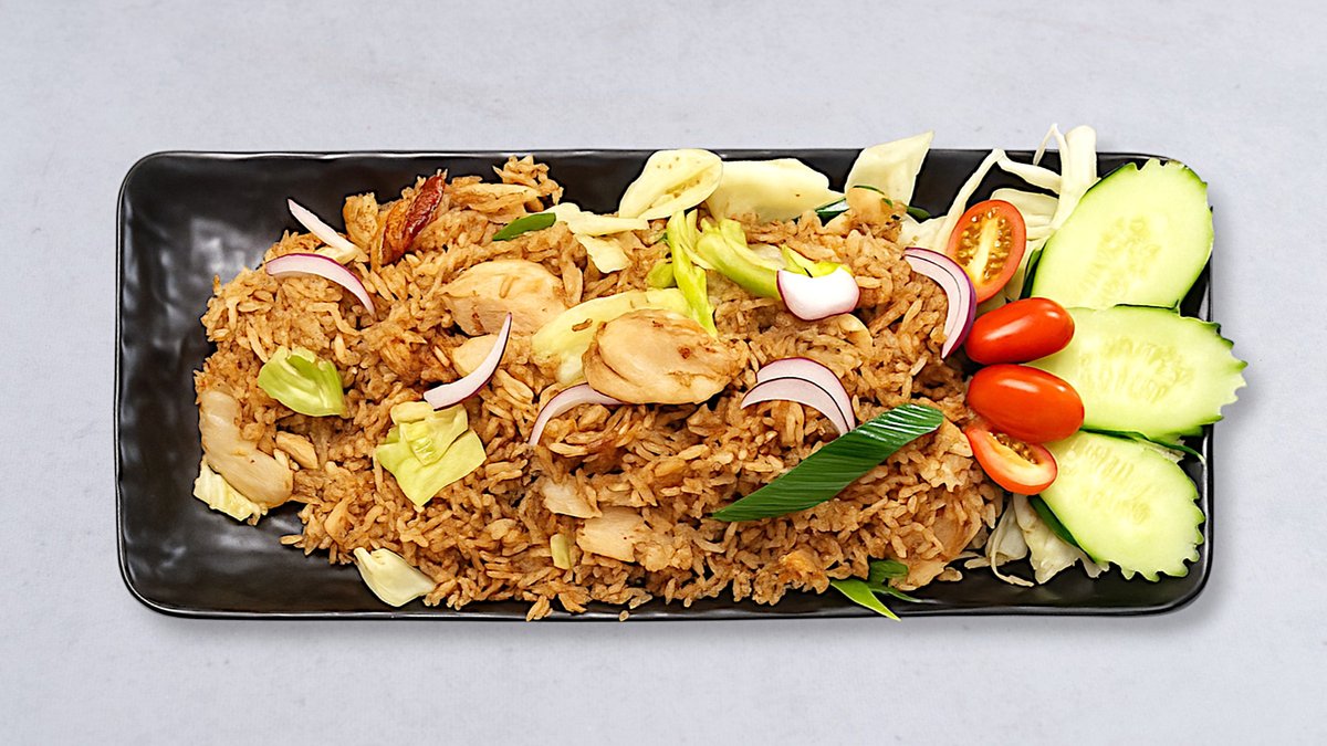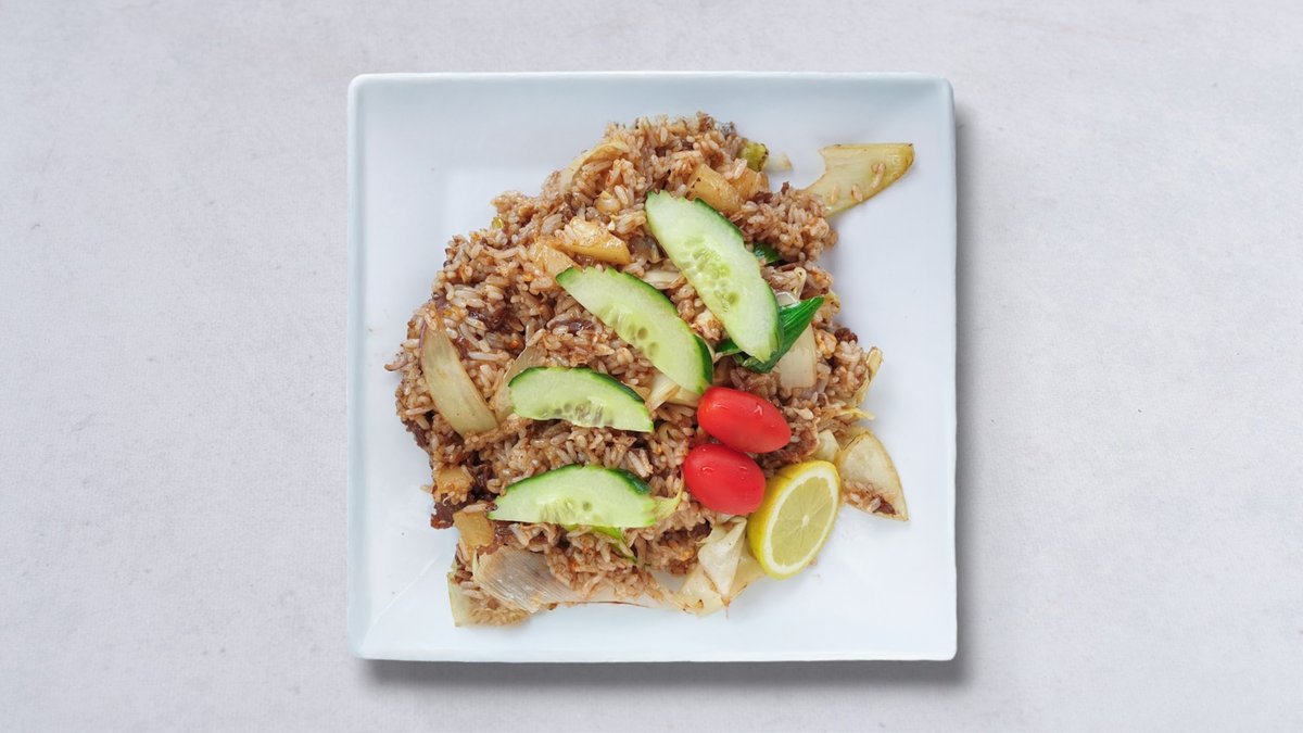 Stekt ris med ägg, gulcurrypulver, lök, tomat, rusin, gräslök, cashewnötter, gurka och lime.