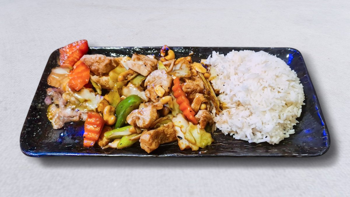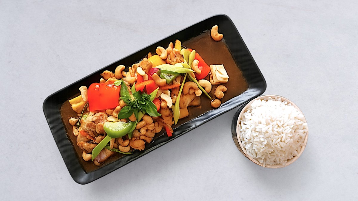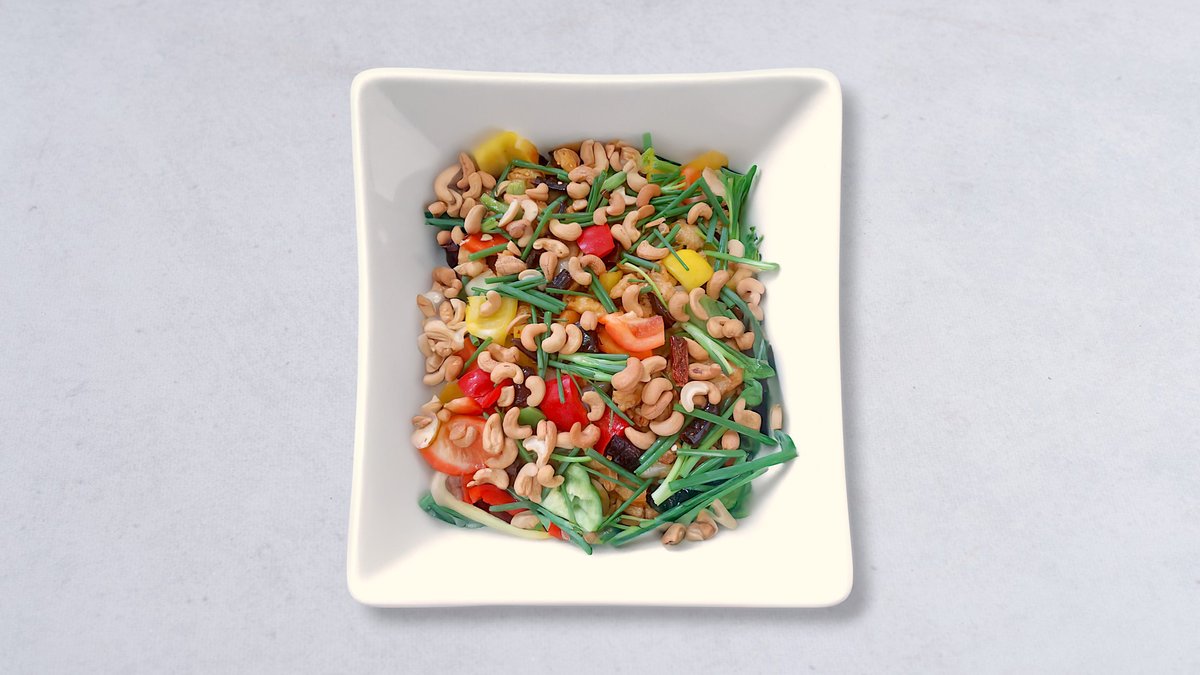 Wokad chilipasta, vitlök, lök, paprika, vitkål, morötter, purjolök, thaibasilika, cashewnötter.