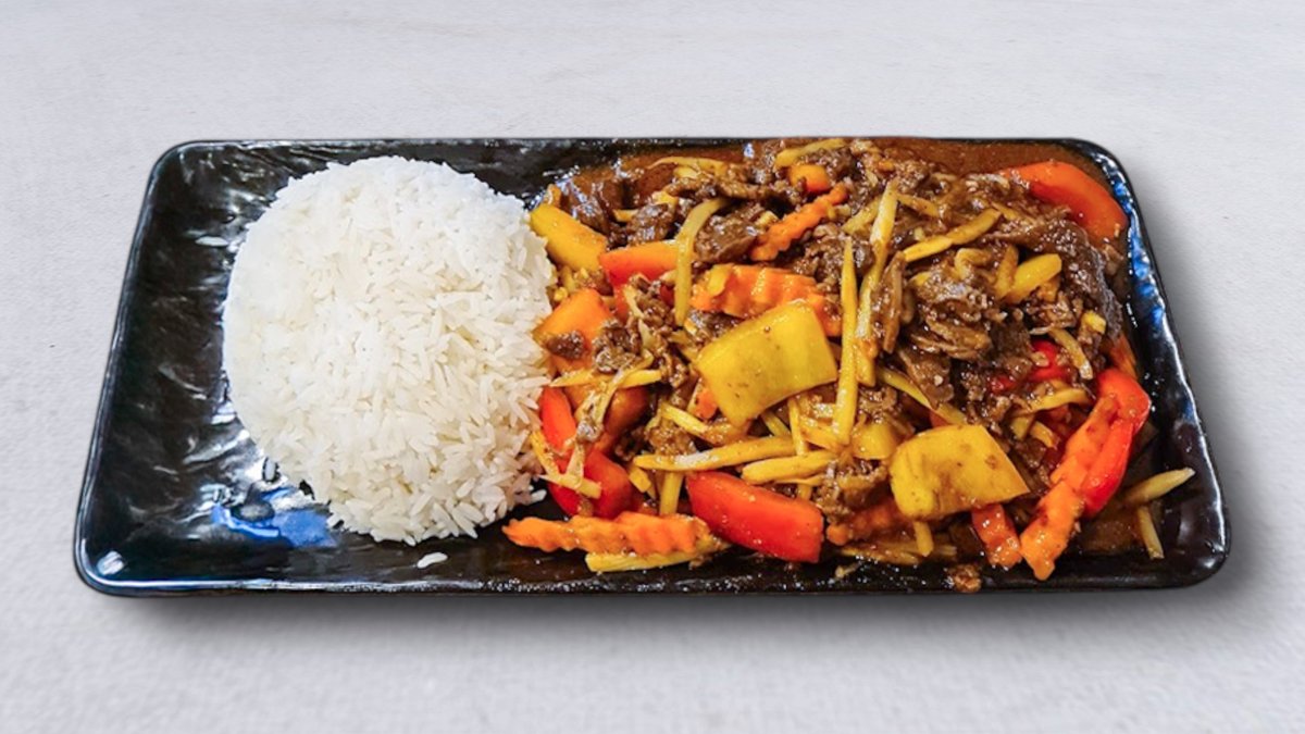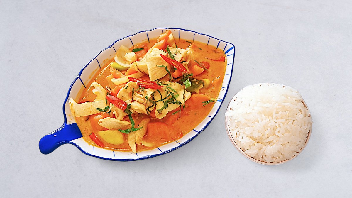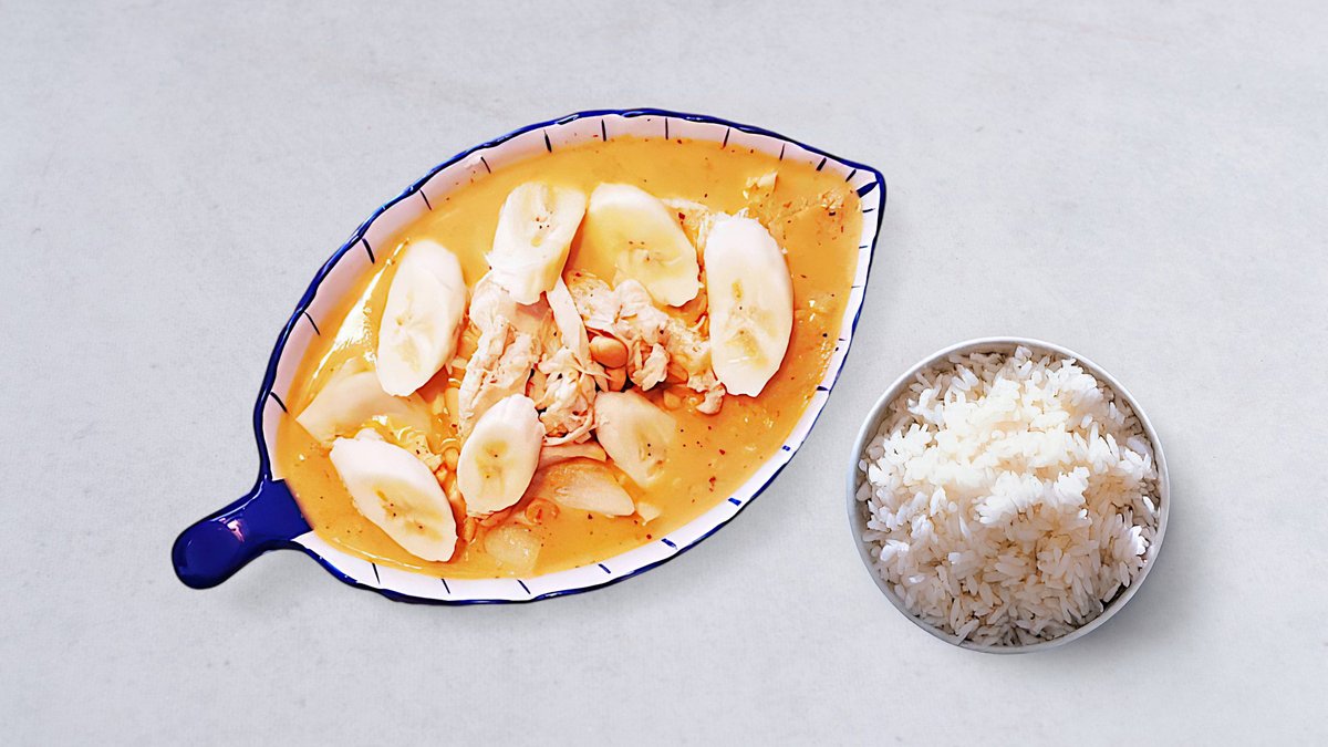 Massaman curry med lök, potatis, jordnötter, morötter och kokosmjölk.