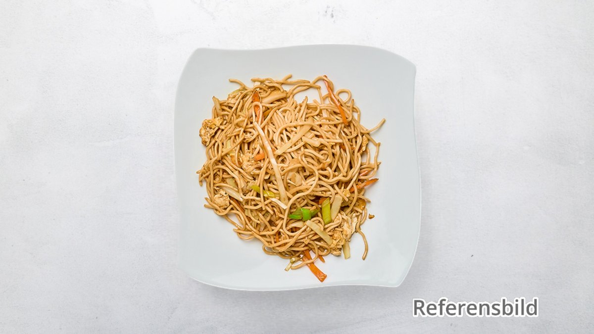 Wokade ägg, risnudlar, vitlök, chili, morötter, vitkål, broccoli, purjolök, thaibasilika och ostronsås.