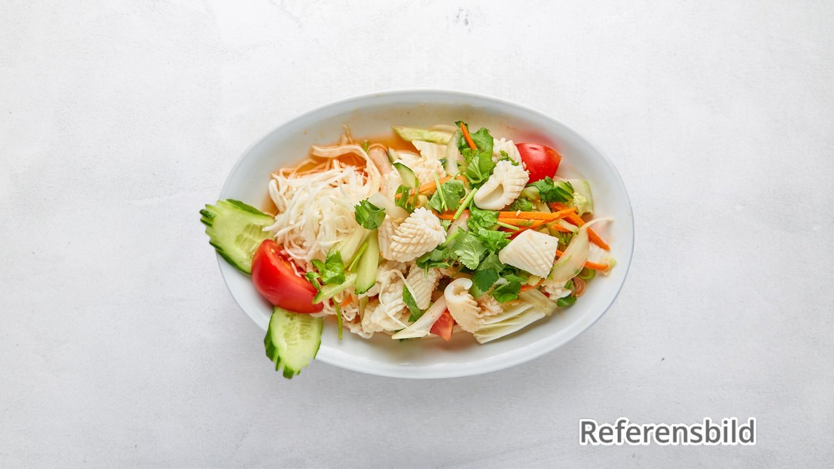 Glasnudlarsallad, lök, tomat, koriander, gräslök, selery, chili, vitlö och jordnötter.