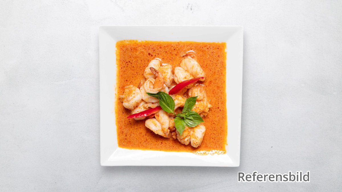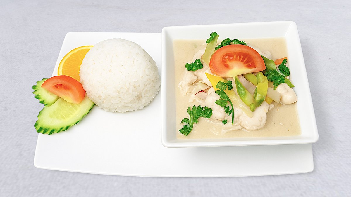 Panäng curry med lök, paprika, morötter, limeblad och kokosmjölk.