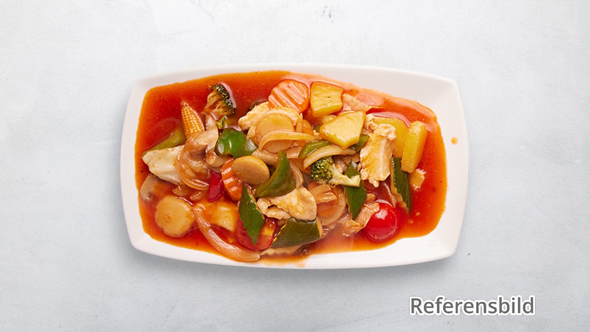 Wokad vitlök, lök tomat, paprika, ananas, gurka, purjolök, chilisås, vitpeppar.