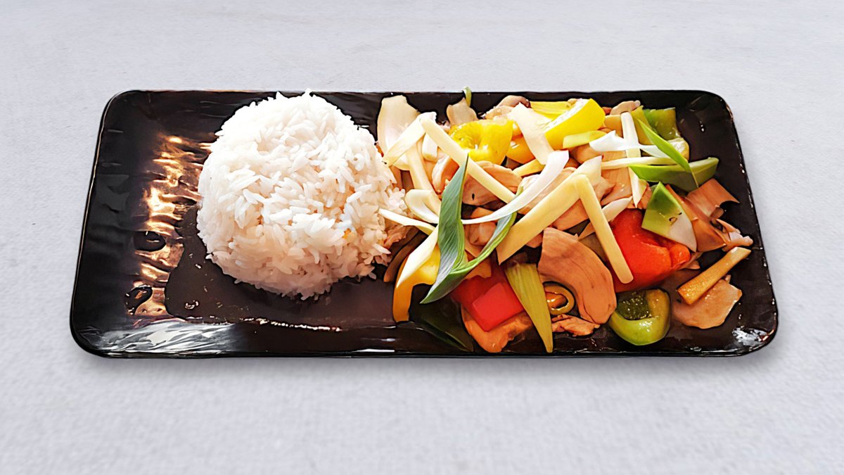 Wokad vitlök, ingefära, paprika, champinjoner, purjolök, ostronsås, soja.