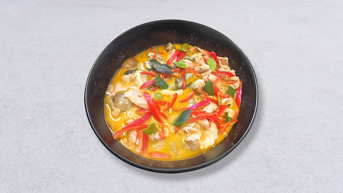 Wokad ägg gulcurry pulver, chilipasta, kokosmjölk, lök, paprika, morötter, blomkål, selleri.