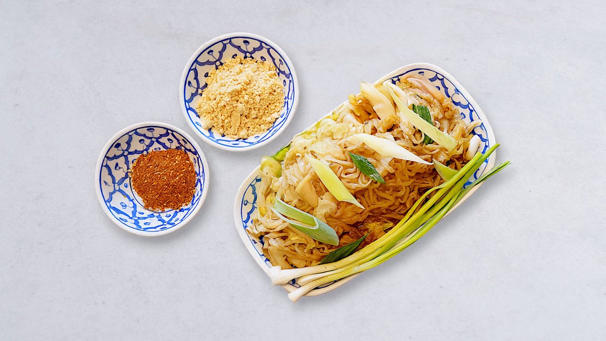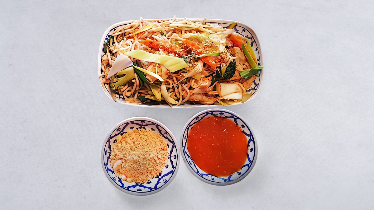 Wokade risnudlar med vitlök, rödlök, ägg, vitkål, böngrodda, gräslök, purjolök, chili, lime, ostronsås, padthaisås, och jordnötter.