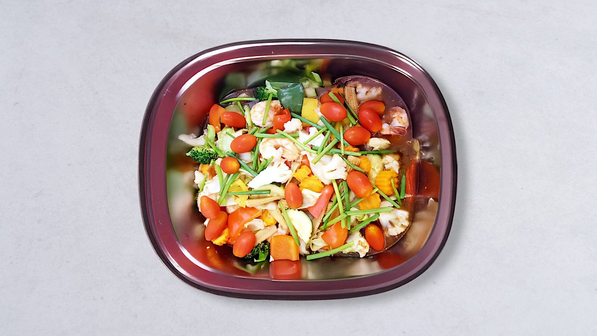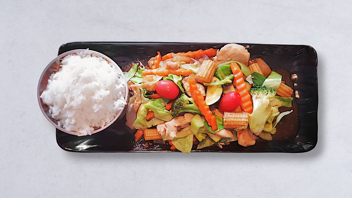 Wokad vitlök, broccoli, vitkål, zucchini, ananas, minimajs, tomat, morötter, ostronsås.