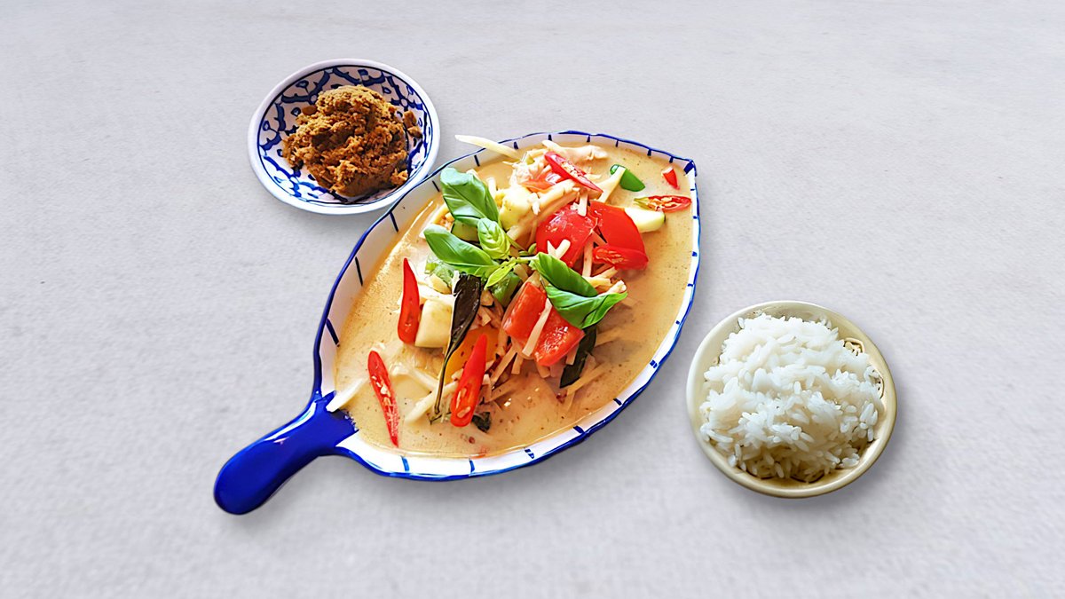 Grön curry med bambuskott, zucchini, paprika, thai basilik och kokosmjölk.
