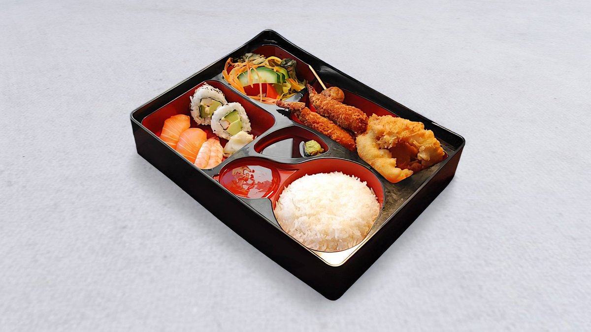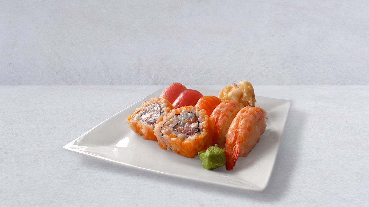 Sushi 5 bitar, friterad kyckling 3 st, friterade räkor 2st, kyckling vingar 2st. Serveras med ris och sallad.