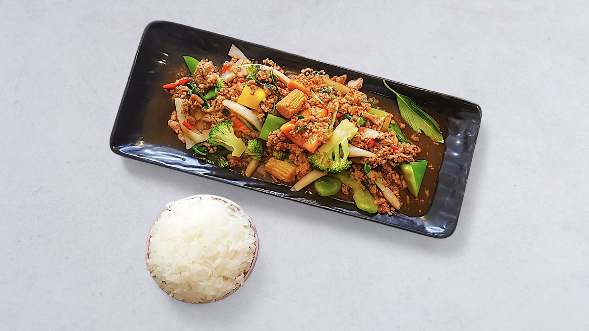 Wokad chili, vitlök, lök, paprika, broccoli, minimajs, thai hot basilika, ostronsås, soja.