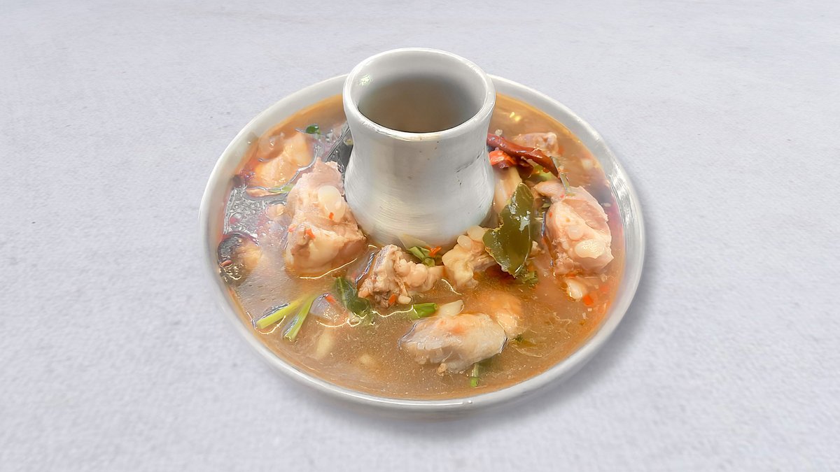 Kycklingsoppa med chiliflake, galangal, limeblad, citrongräs, rostaderis, citron, fisksås, champinjoner, chili, koriander, purjolök, tomat och rödlök.