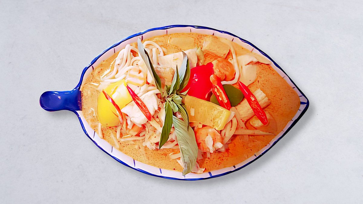 Rödcurry med äggnudlar, bambuskott, morötter, paprika, thaibasilika, kokosmjölk, minimajs, ananas och lök.