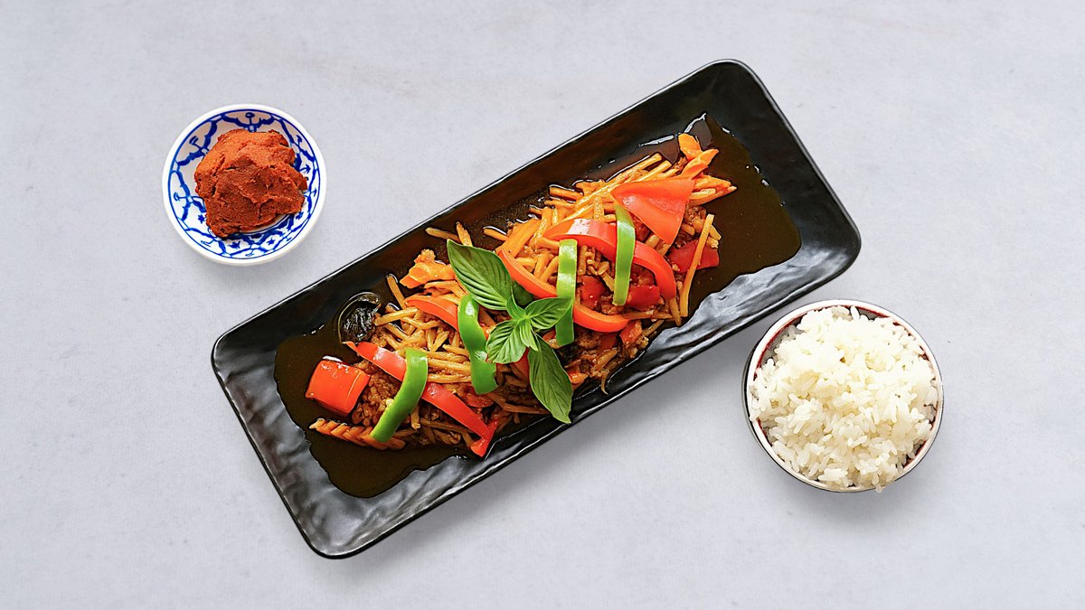 Wokad rödcurry, paprika, morötter, bambuskott, thaibasilika.