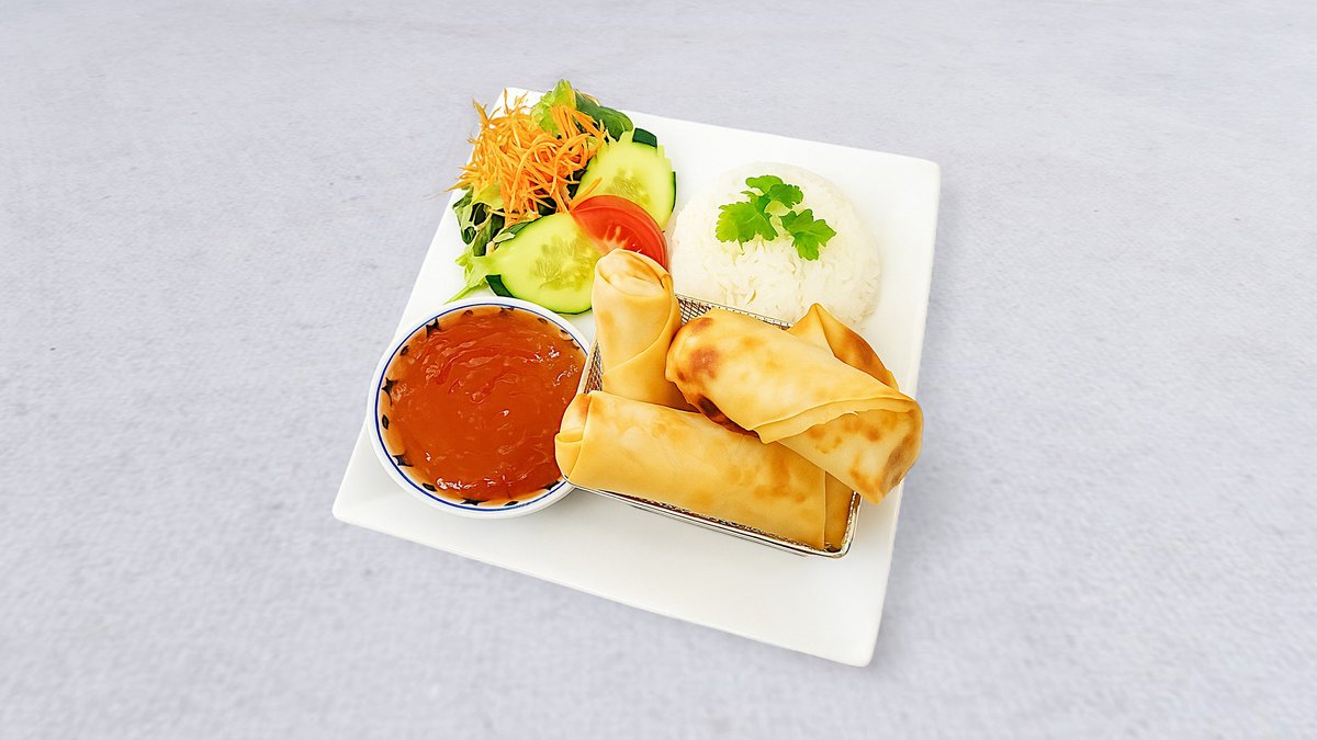 4st egengjorda vårrulla med fläskfars, lök, vitkål, morötter, purjolök, vitpeppar, glasnudlar med sweet chilisås.