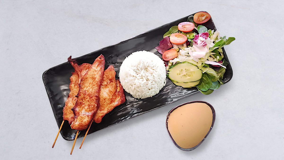 Friterade kycklingspett med jordnötssås. Välj mellan 3 eller 6st.