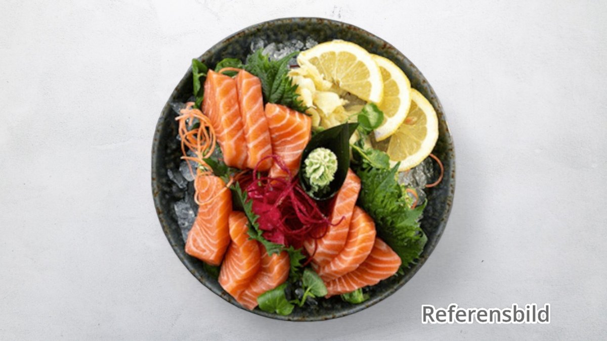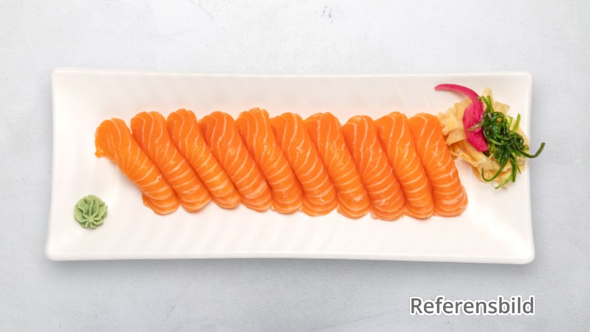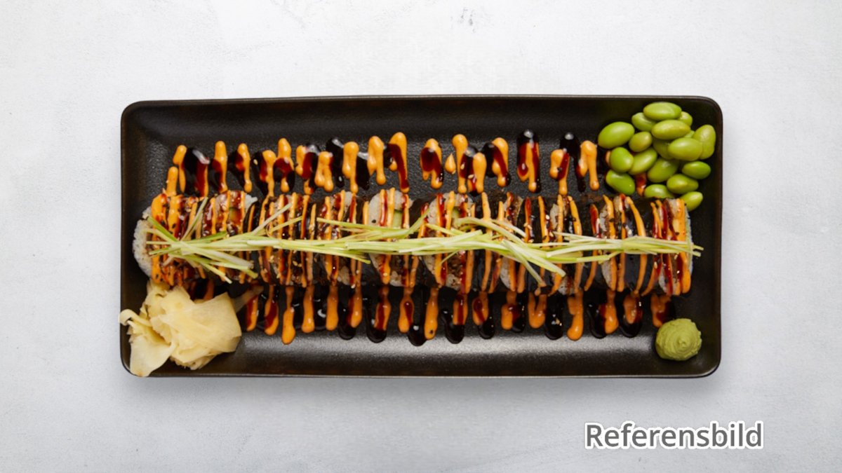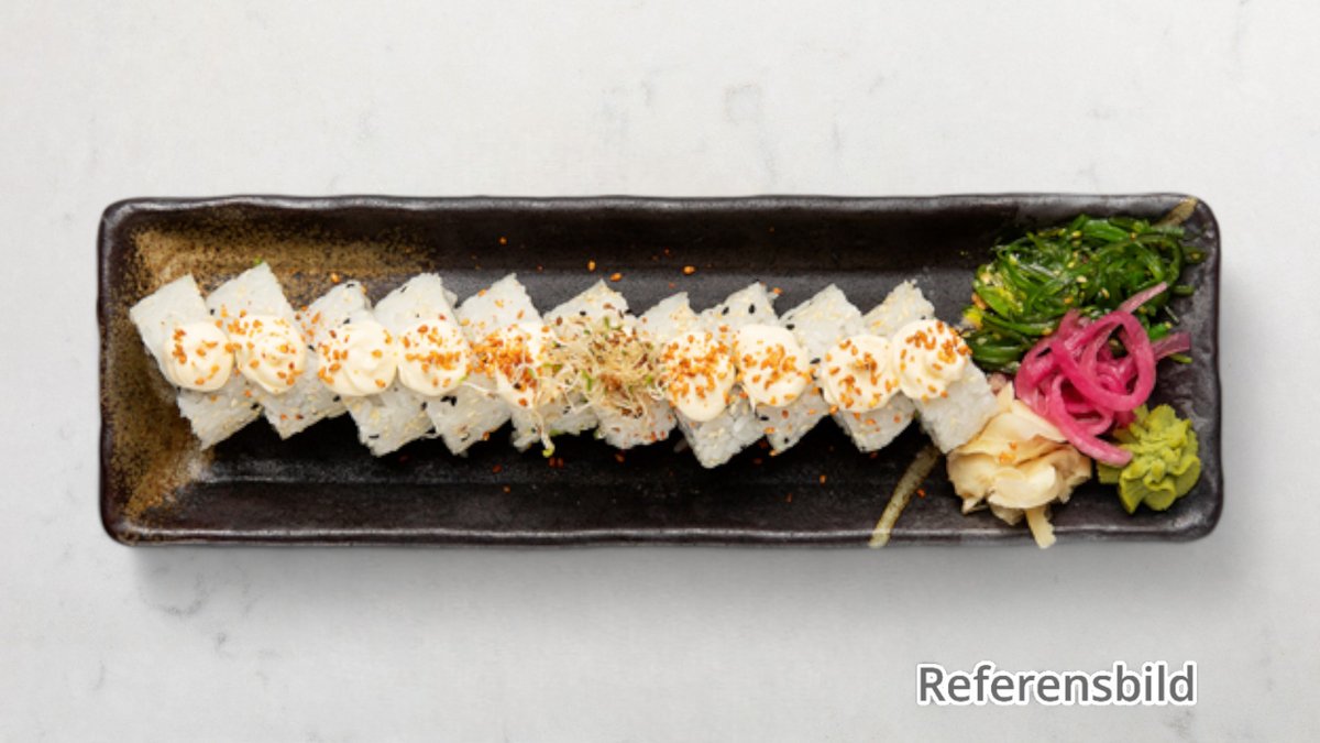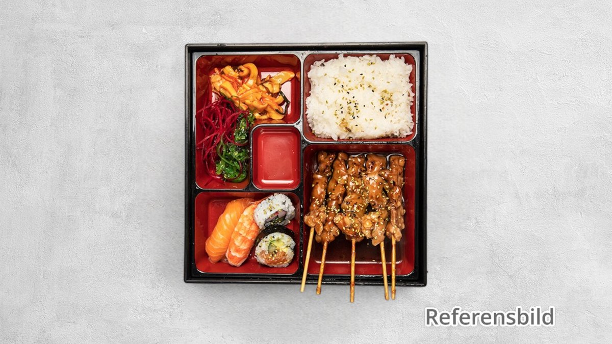 2 bitar sushi, 3 bitar rullar, ris, sallad, nötkött, 2st yakitori spett, teriyakisås och sesamfrön.