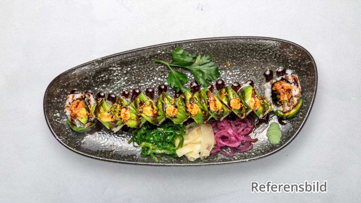 Avokado, gurka, tofu, toppas med avokado och såser.