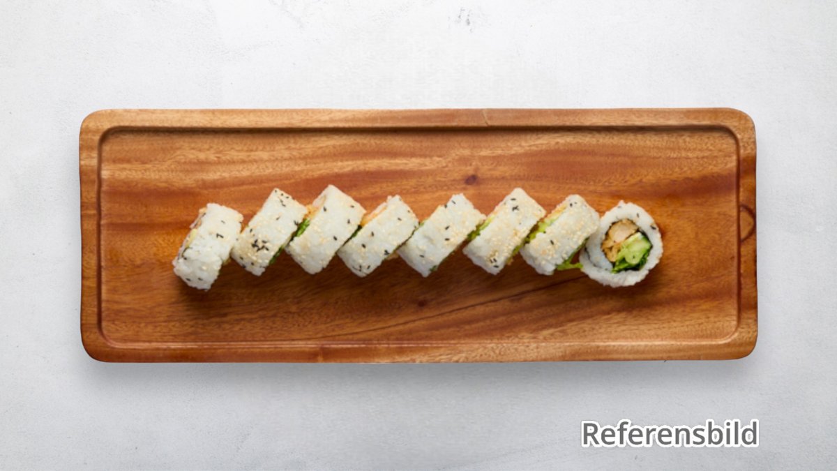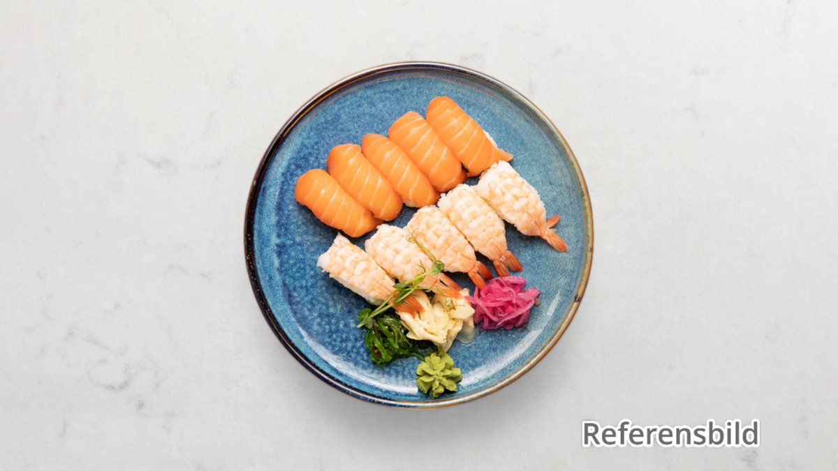 16 bitar. 6 maki, 5 lax, 1 krabba, 1 ål, 1 avokado, 1 tonfisk och 1 räka.