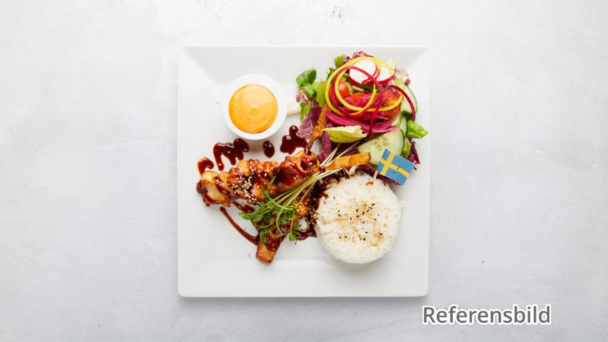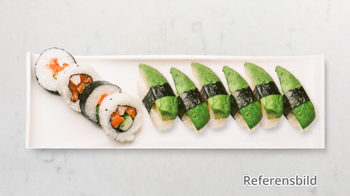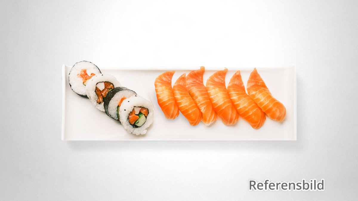 2 bitar sushi, 3 bitar rullar, ris, sallad, 4st yakitori spett och teriyakisås.