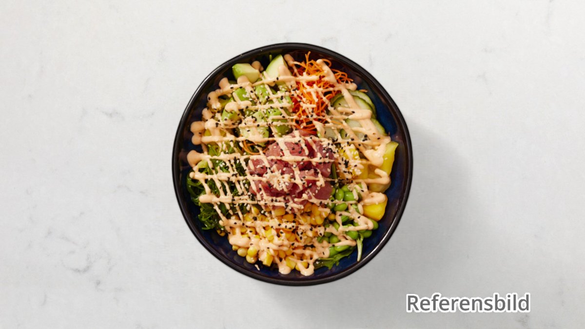 Ris, mango, ingefära, avokado, sjögrässallad, morot, cocktailtomater, sesamfrö, gurka, sojabönor, spetskål, rödkål, toppad med såser.