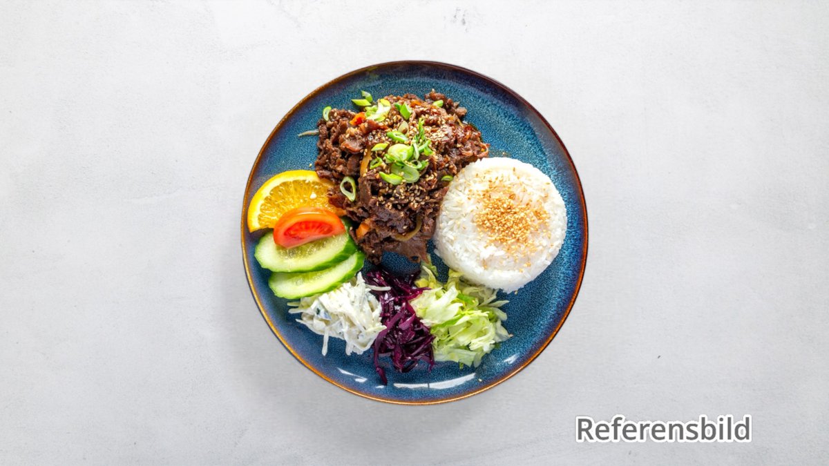 2 Bitar sushi, 3 bitar rullar, ris, sallad, nötkött, teriyakisås, och sesamfrön.
