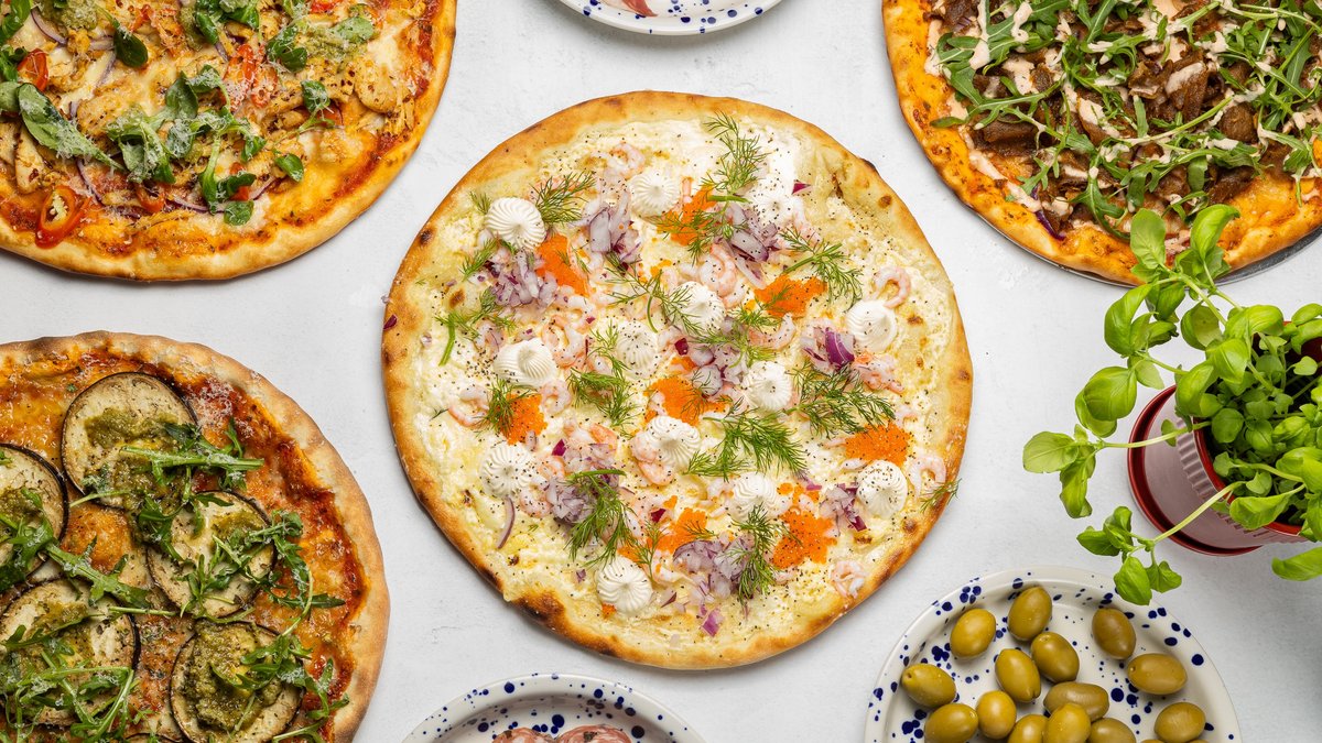 Medelhavsinspirerad pizzameny med grekisk touch och växtbaserade alternativ.