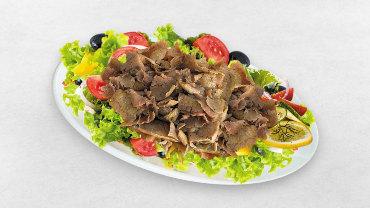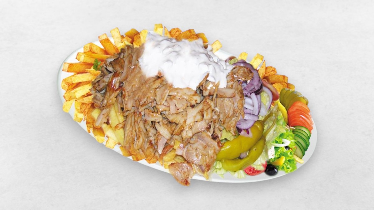 Pommes eller ris, gurka, tomat, isbergssallad, rödlök, feferoni och valfri sås.