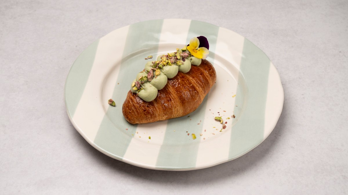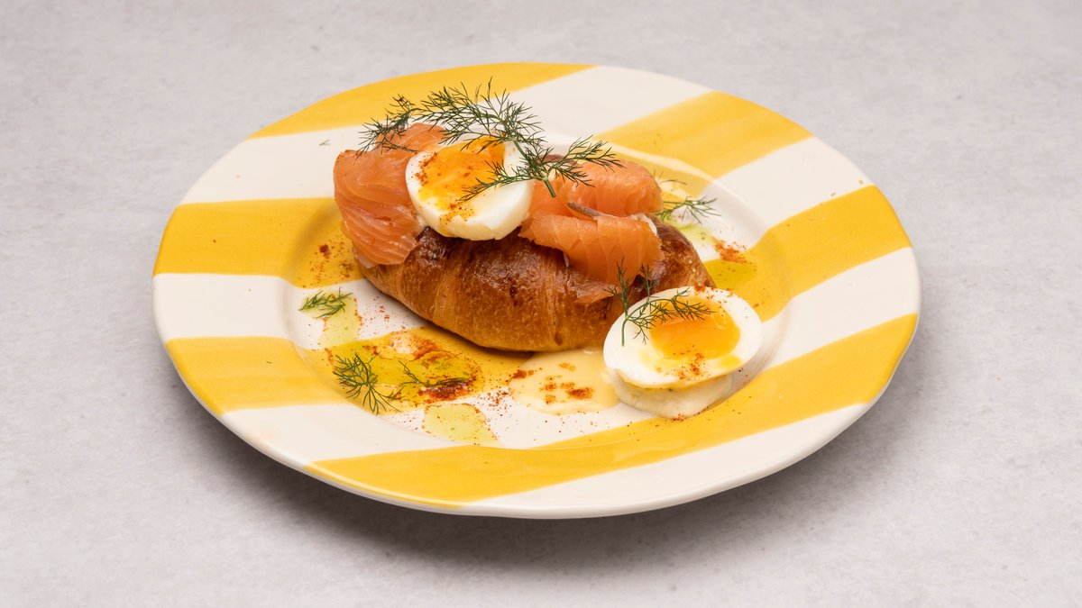 Smörig croissant med kallrökt lax, löskokt ägg, örtfärskost och picklad chili.
