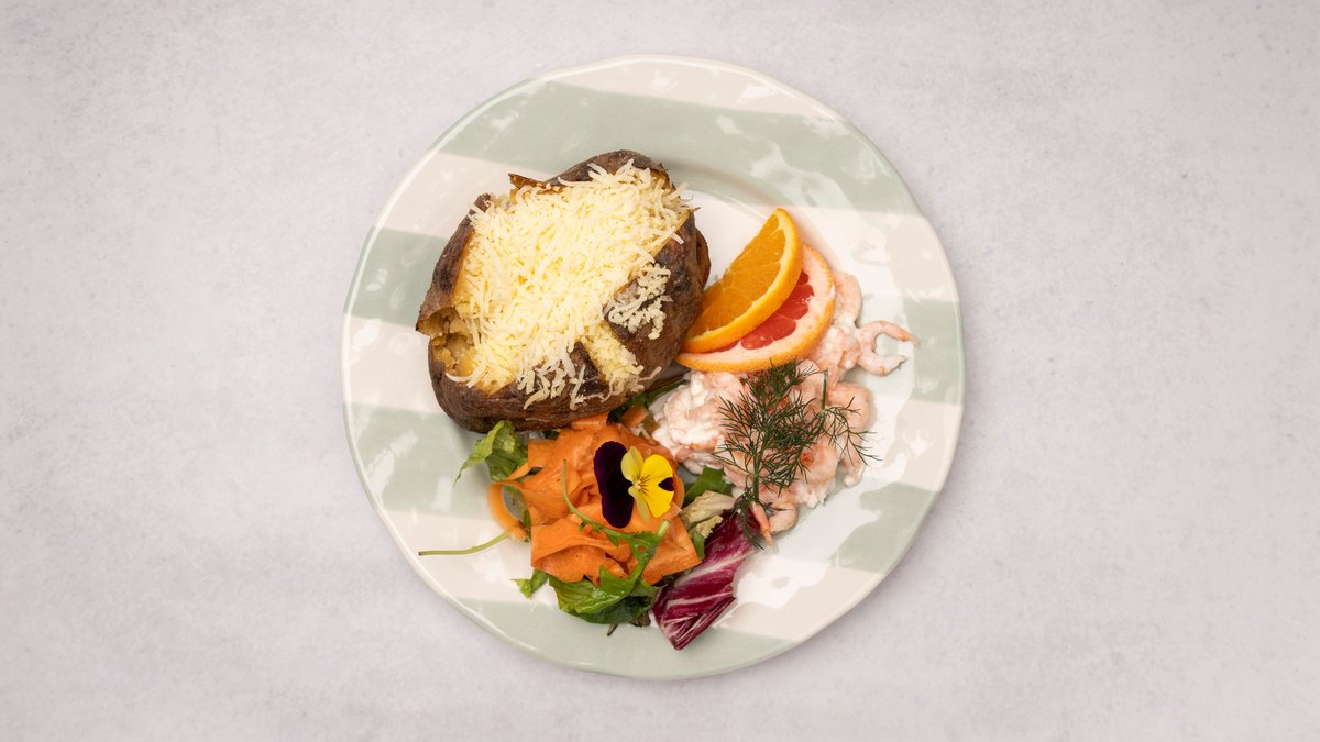 Bakad potatis med skagenröra. Toppas med picklad rödlök och dill.