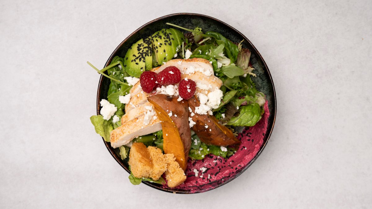 Sallad med grillad kyckling, rostad sötpotatis, avokado, smulad fetaost, ruccola, hallon, hembakade levainkrutonger och örtvinägrett.