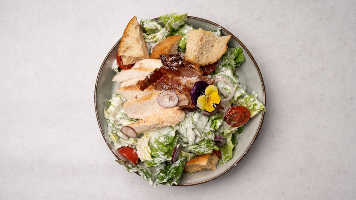 Klassisk caesarsallad med kyckling, romansallad, knaperstekt bacon, parmesan, hembakade levainkrutonger och caesardressing.