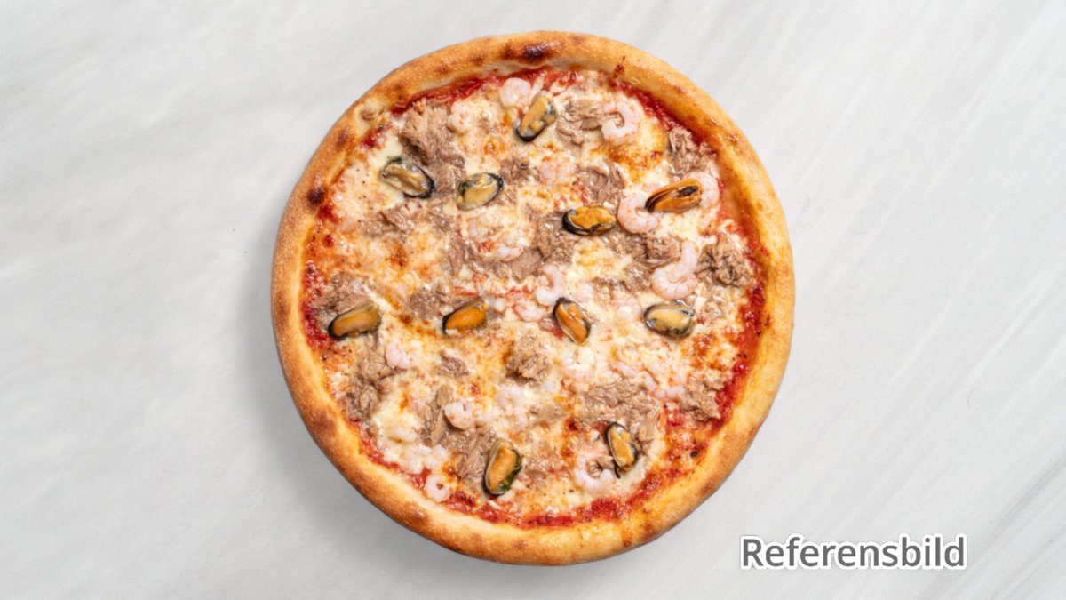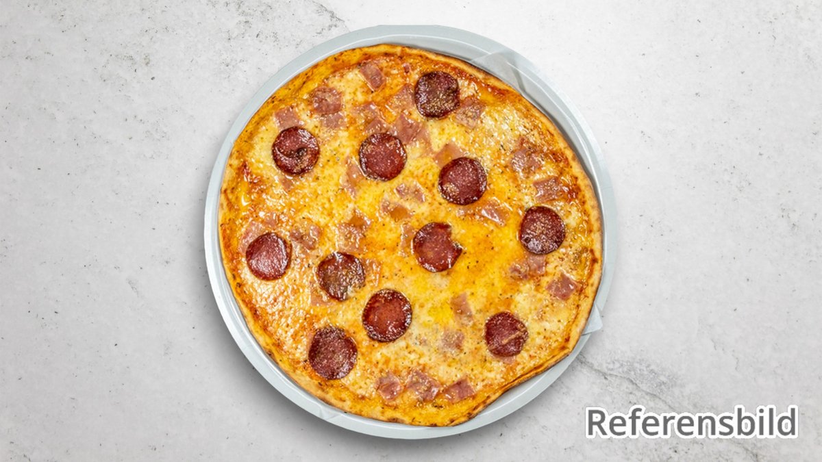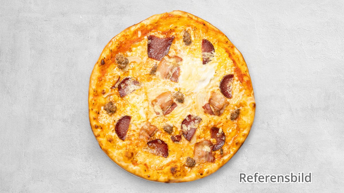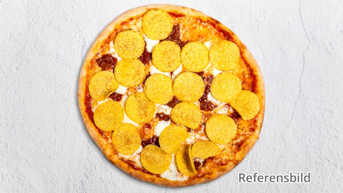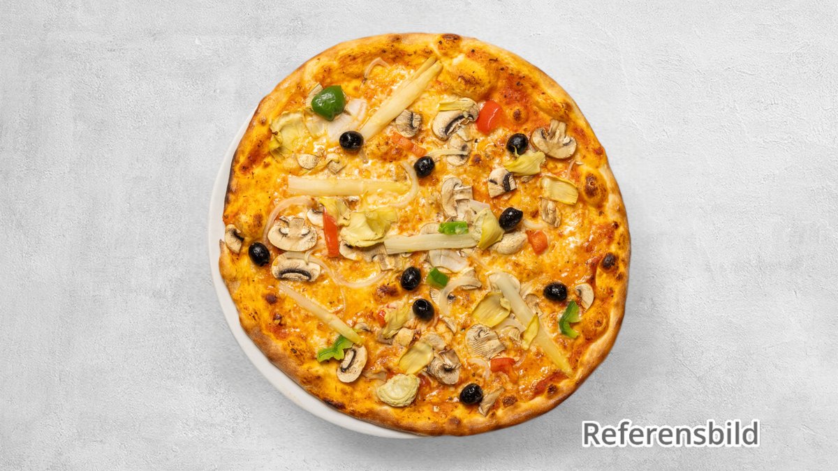 Tomatsås, ost, champinjoner, tomater, oliver, paprika och lök.