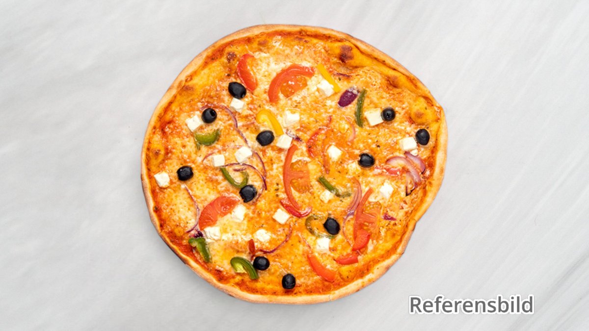 Tomatsås, ost, fetaost, tomater, oliver, lök och vitlök.