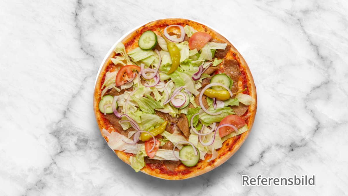 Kebabkött, isbergssallad, tomater, feferoni och lök.