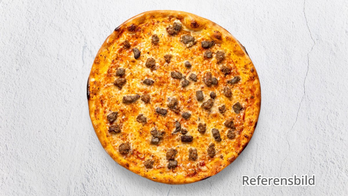 Tomatsås, ost, köttfärs, jalapeño och tacosås.