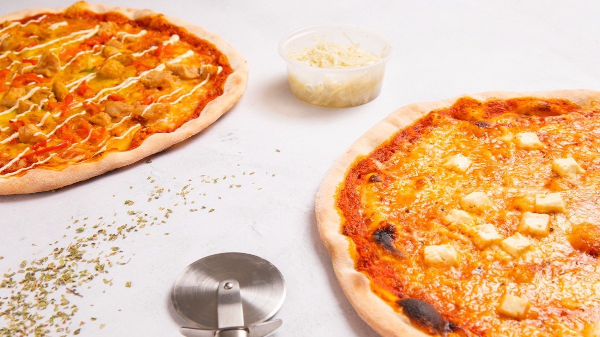 Tomatsås, ost, skinka, ananas, räkor och curry.