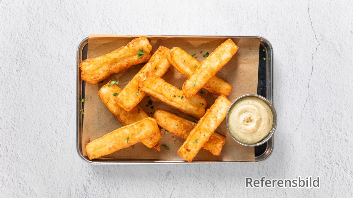 Ölfriterad färsk kolja, serveras med pommes frites, tartarsås, ärtröra och citron.