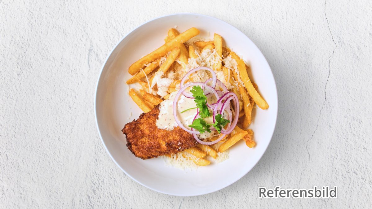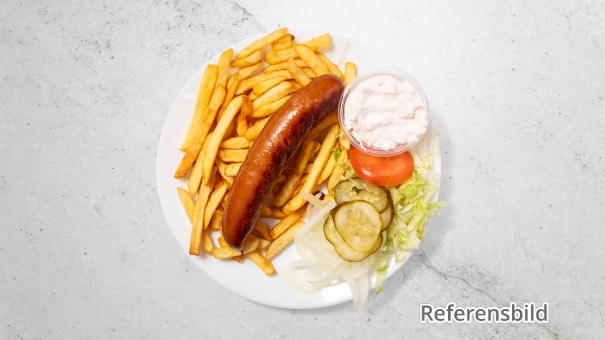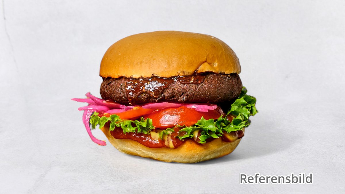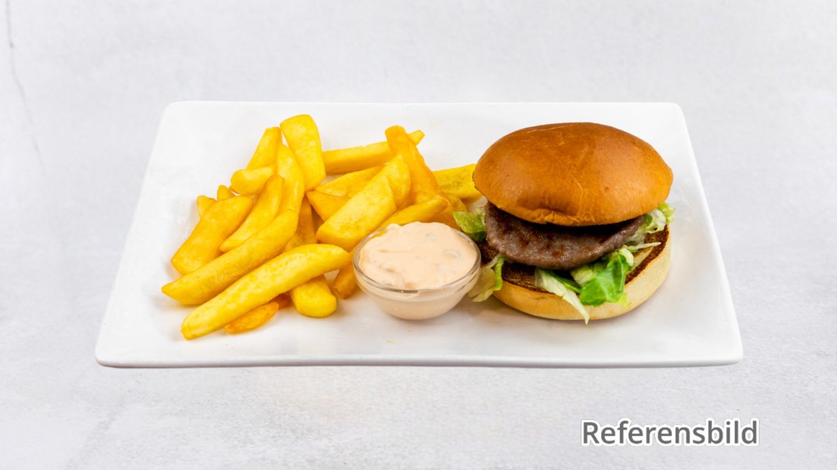 Bröd, 2 x veganburgare 90 g, vegancheddarost, sallad, picklad rödlök, saltgurka, pommes, örtdipp (går att få glutenfri).