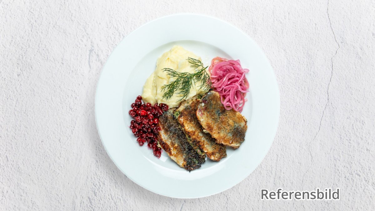 Marinerad stekt strömming på mannerströms vis, serveras med potatis-pure, rårörda lingon och brynt smör citron.