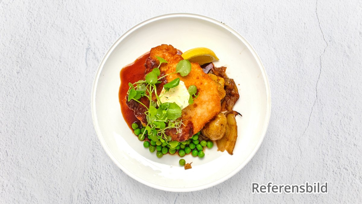 Krispig pankopanerad fläskschnitzel serveras med stekt potatis, anjovissmör friterad grönkål och citron.