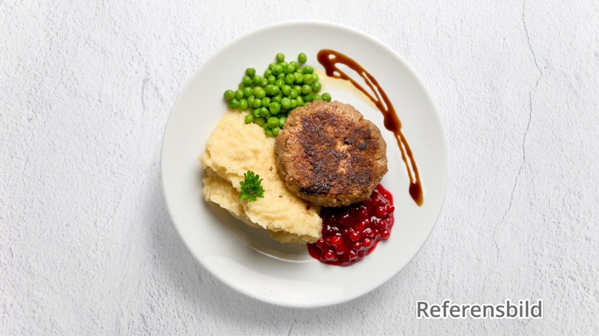 Ölhallens köttbullar, serveras med potatispuré, rårörda lingon, gräddsås och pressgurka. Finns även som vegetariskt alternativ.