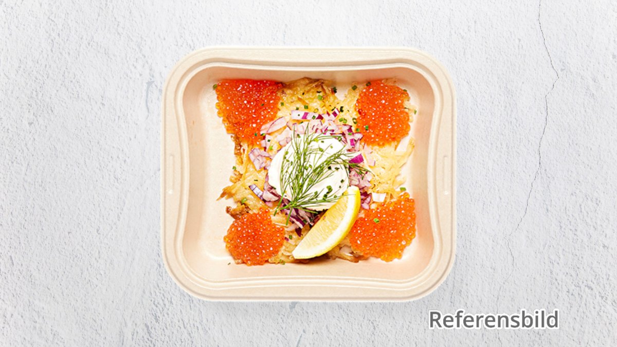 Råriven stekt potatis, löjrom smetana rödlök, citron och dill