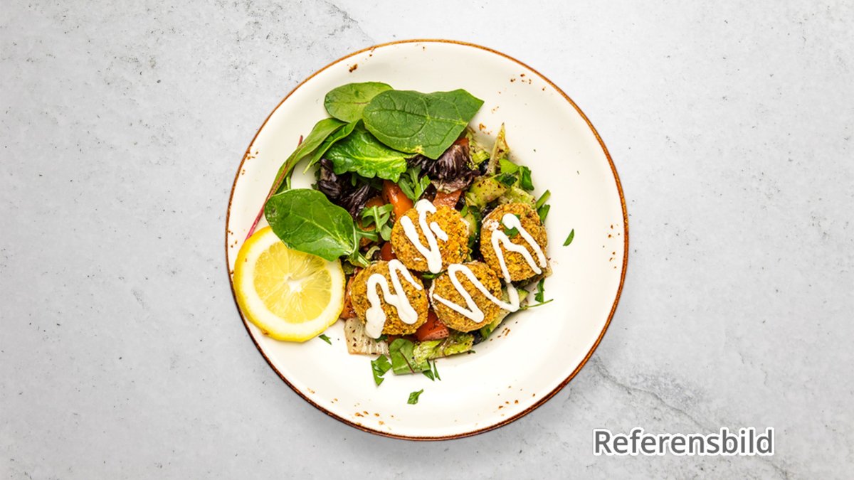 Serveras med sallad, tomat, lök, rödkål, feferoni och valfri sås.