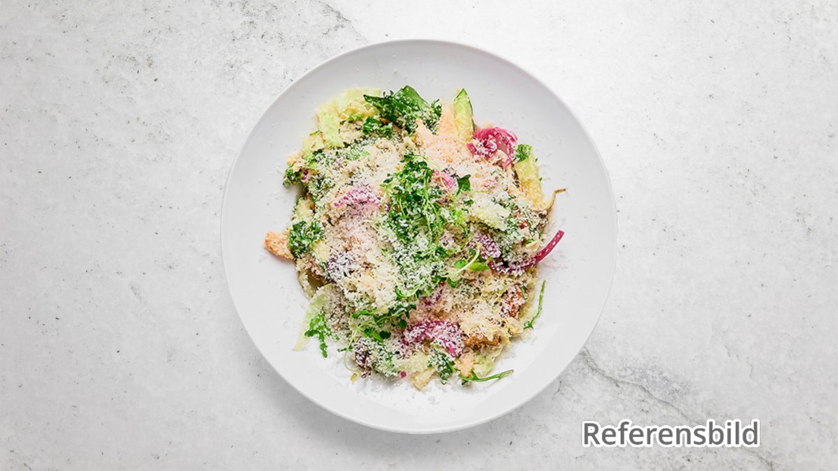 Tryffelost, ost, grönkål, kantareller, picklad rödlök, grana padano och frisésallad.
