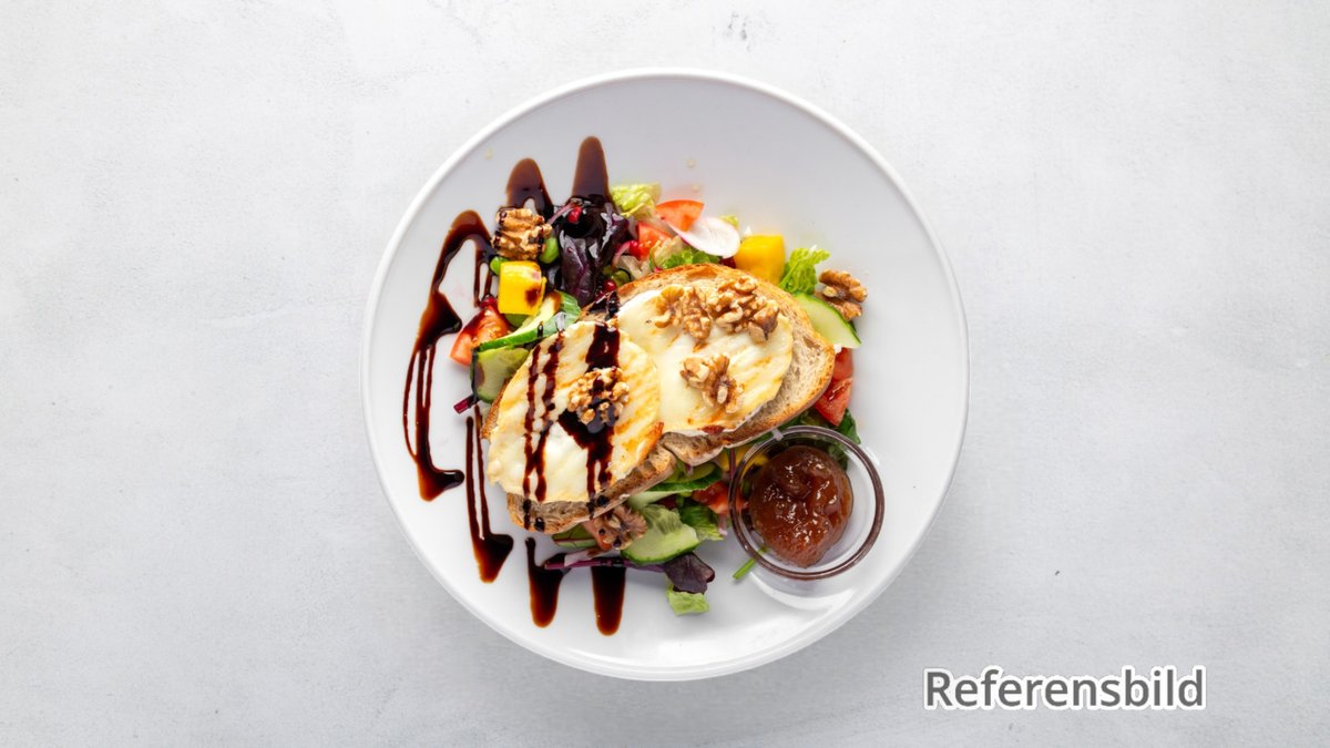 Mixsallad, tomat, picklad rödlök, bakade betor, valnötter, chèvre, balsamicosirap och citron.