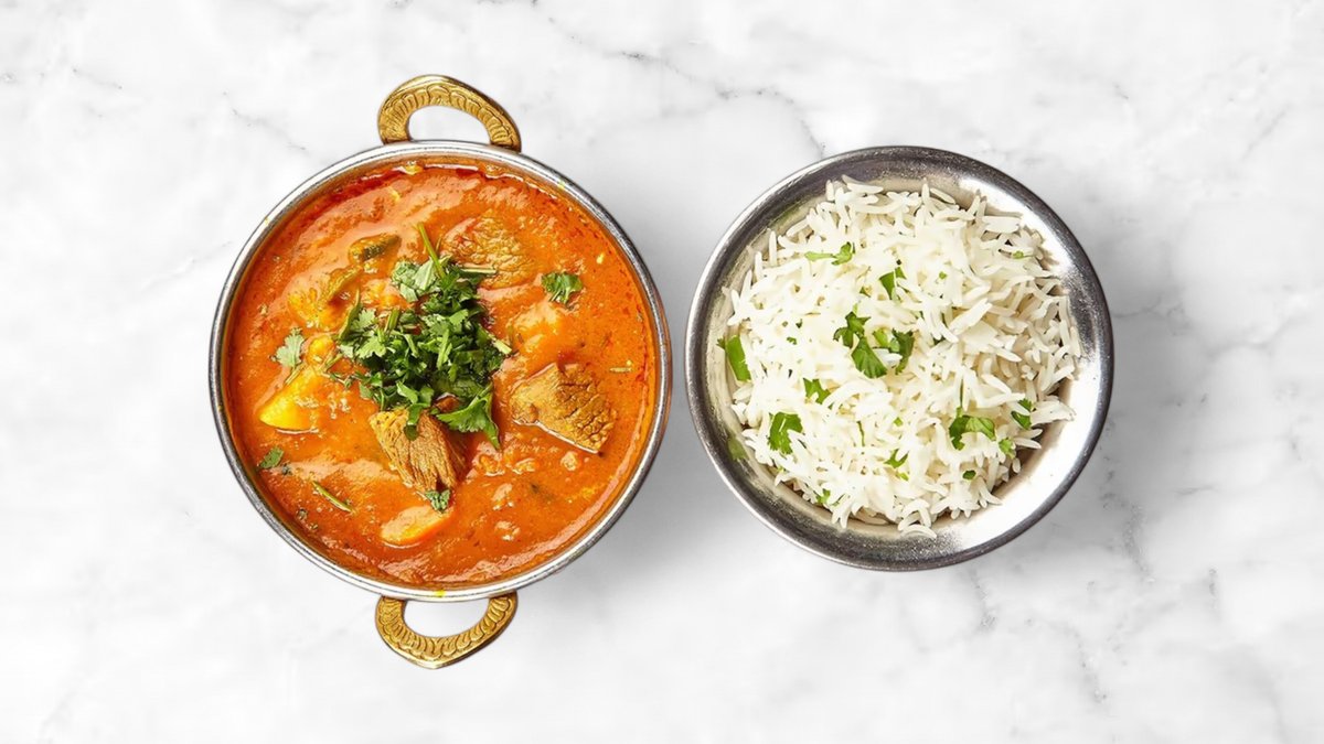 Rätt med hemlagad sås av färska tomater, lök, koriander, kummin, kanel, ingefära, vitlök och speciella kryddor. Serveras med ris, sallad och myntasås.
